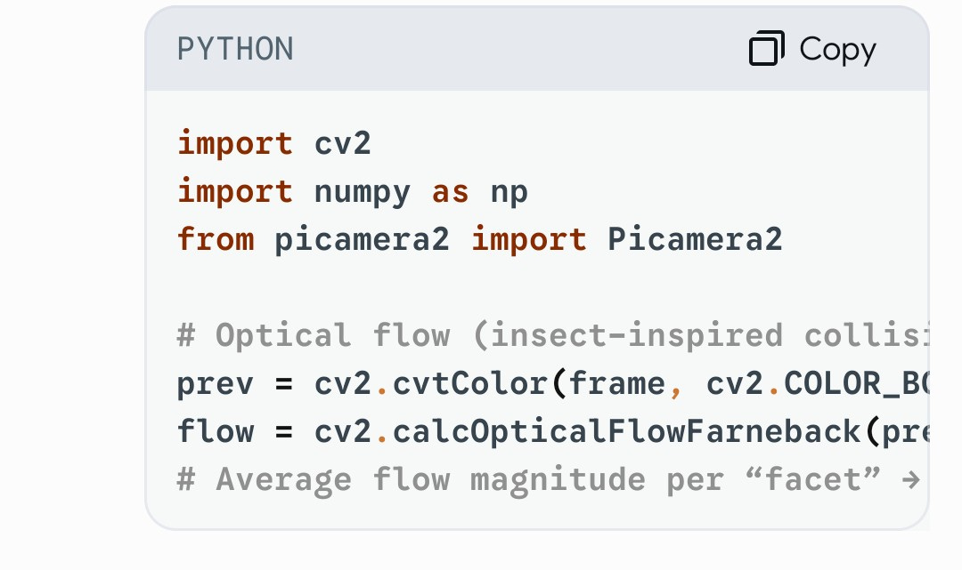 - Program simple behaviors: “If optical flow on left facets > threshold → yaw right”